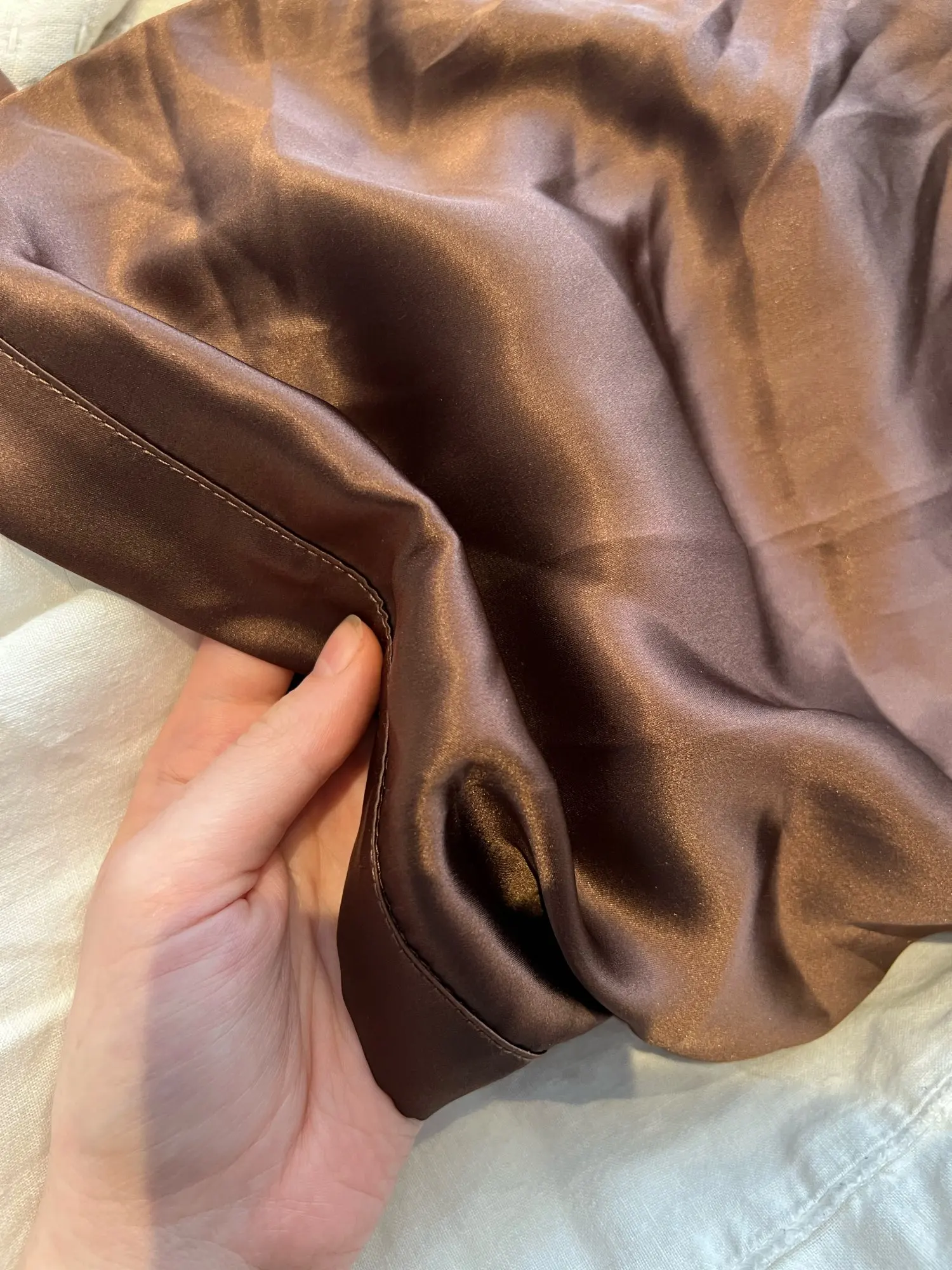 La soie de mûrier certifiée Oeko-Tex est une fibre 100 % naturelle qui laisse les cheveux respirer et préserve leur hydratation, contrairement au satin souvent en polyester, qui retient la chaleur.